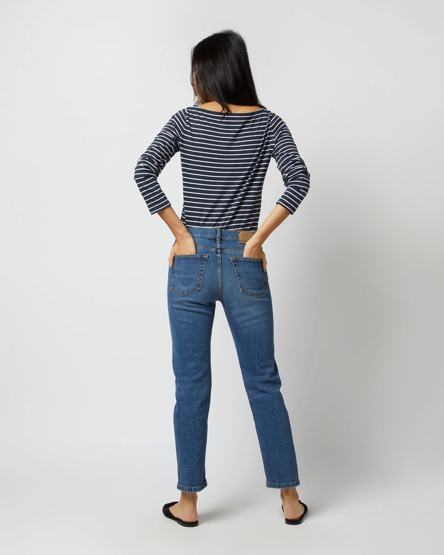 Stockholm-based Jeanerica is our latest favorite minimalist denim line, specializing in “essential styles in perfect fits with understated details and expert washes.” Sounds pretty good to us. This is their Classic Jean, a cropped, slim, mid-rise silhouette that’s relaxed through the thigh and tapered from the knee down. This pair is made of vintage-washed denim in a gently faded shade of blue.