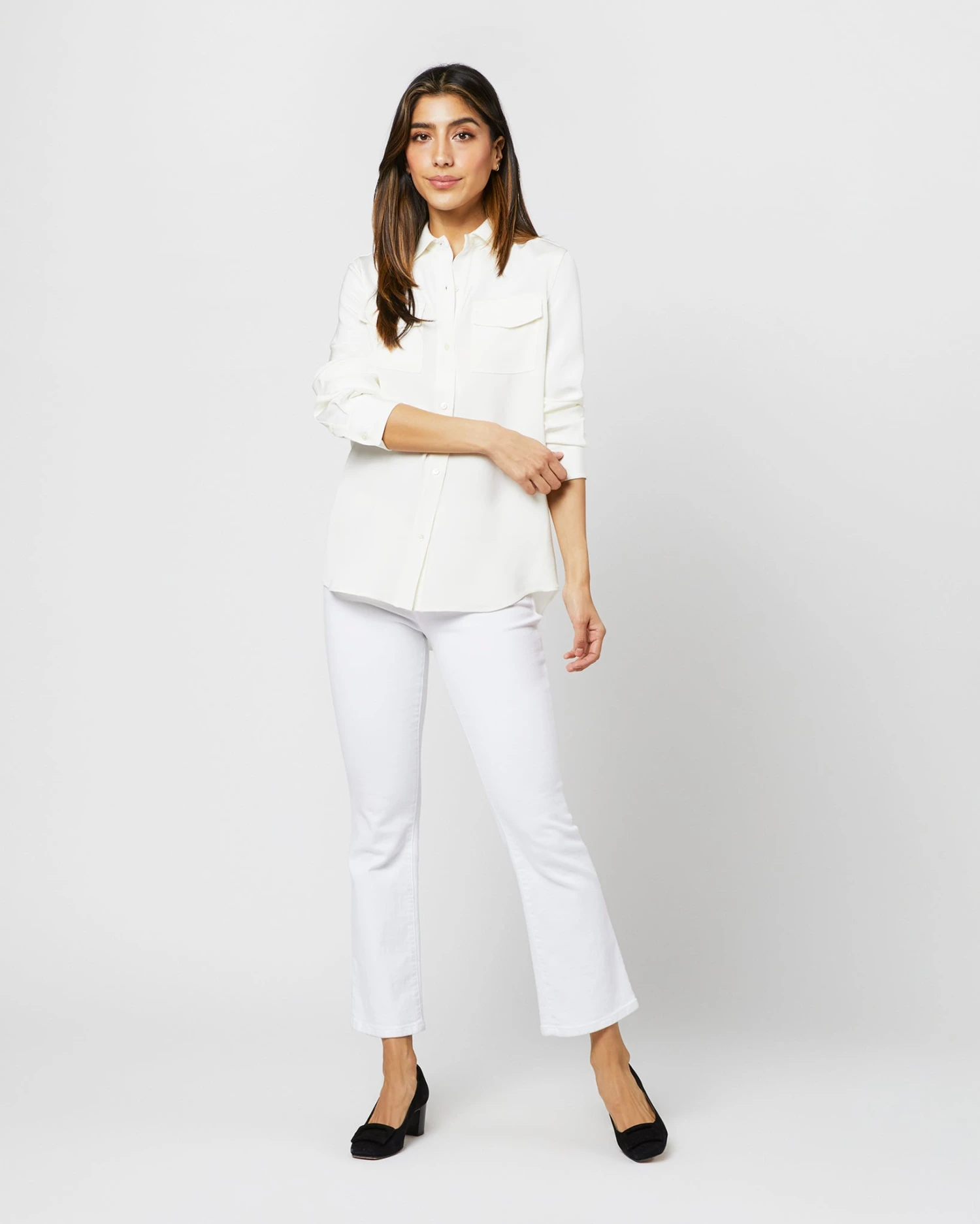 The Hannah is a slightly more utilitarian add to our silk program. The flap pockets and easy fit through the body give it a more tomboy feel than the feminine tie necklines and puffed sleeves of our other shapes, but no less special (and made of the same luxe, 4ply silk crepe de chine with mother of pearl buttons.)