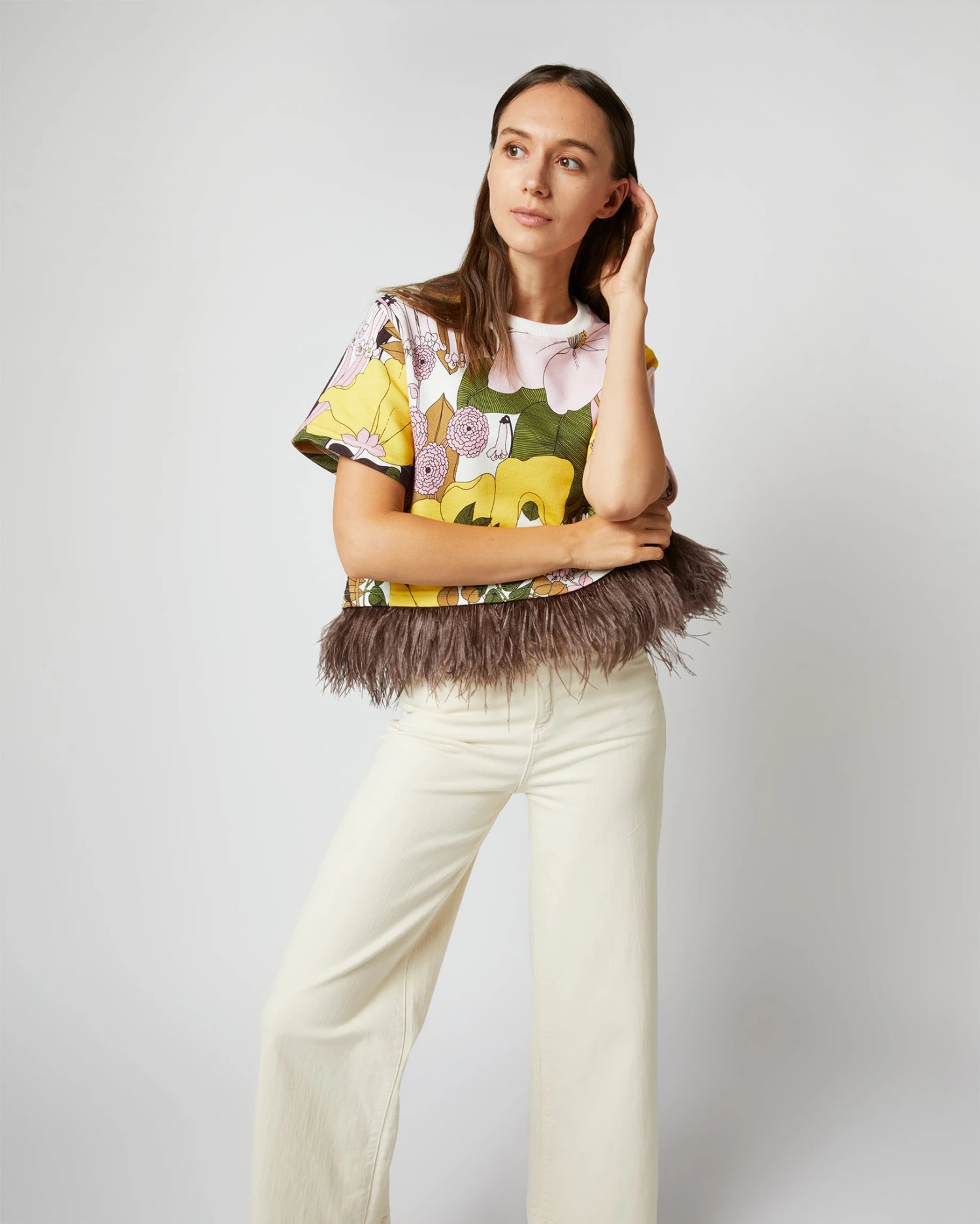 Milan-based La DoubleJ makes party-ready skirts and dresses in reissued vintage fabrics, “distilled through a lens of pure joy, eye-popping print and love of all things maximal.” Sounds about right! This tee is made in Lake Como with a heavy compact cotton that can go dressy or casual (that is – as casual as you want to take ostrich feather trim.) It looks really fun with pants and a pair of heels you already own, but if you want to take it to the next level, there’s a very mod matching skirt.