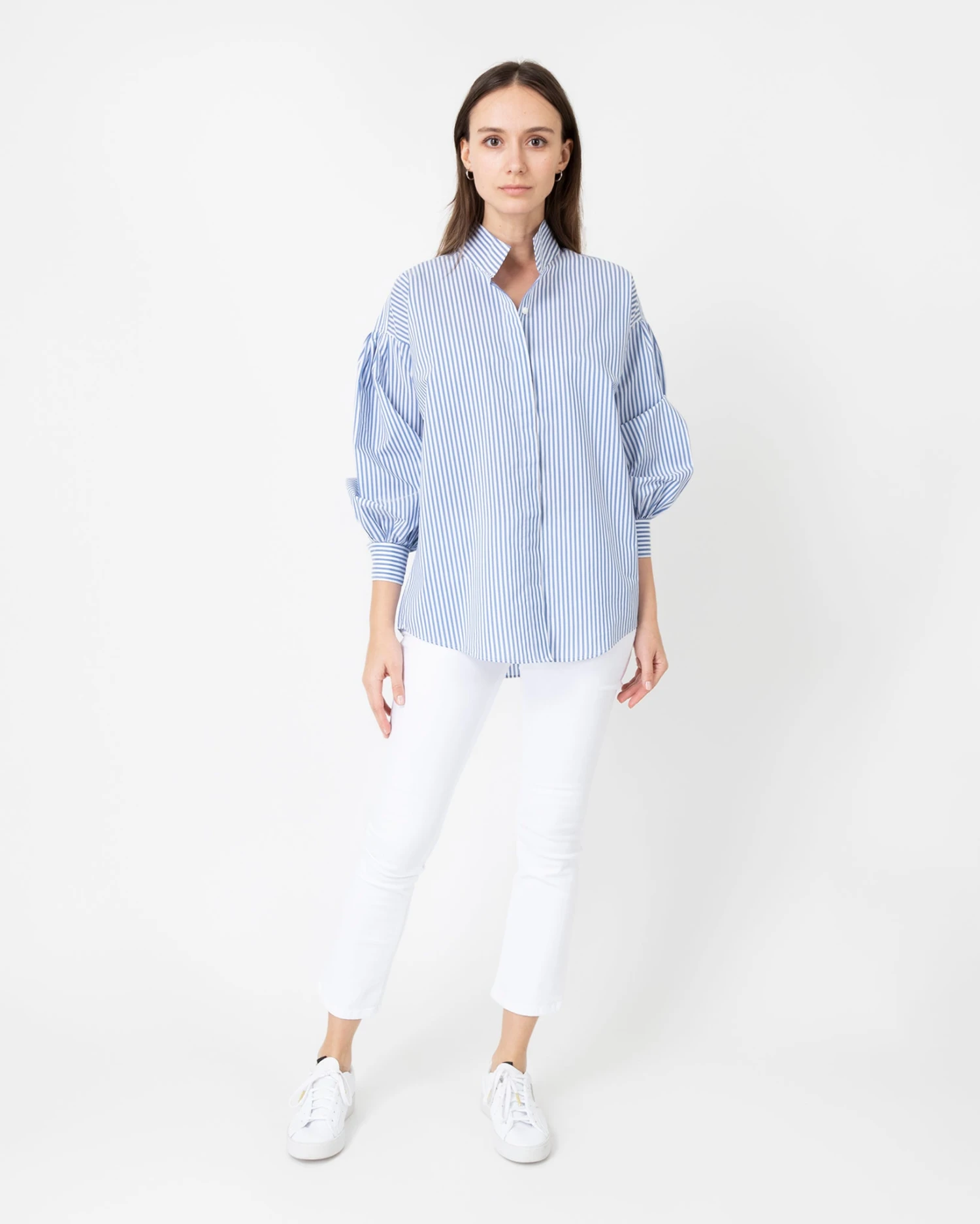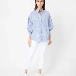 The Mirabella is a hybrid of two of our bestselling shirts, with a stand collar and easy body inherited from the Anaya, and soft puffed sleeves and a full placket from the Paulina. The best of both worlds. And you can never have too many romantic striped shirts, right? This one’s made of a wonderfully drapey blend of Italian cotton and silk. Refined, but not on-the-nose dressy.