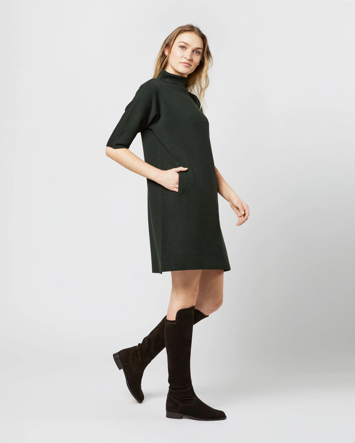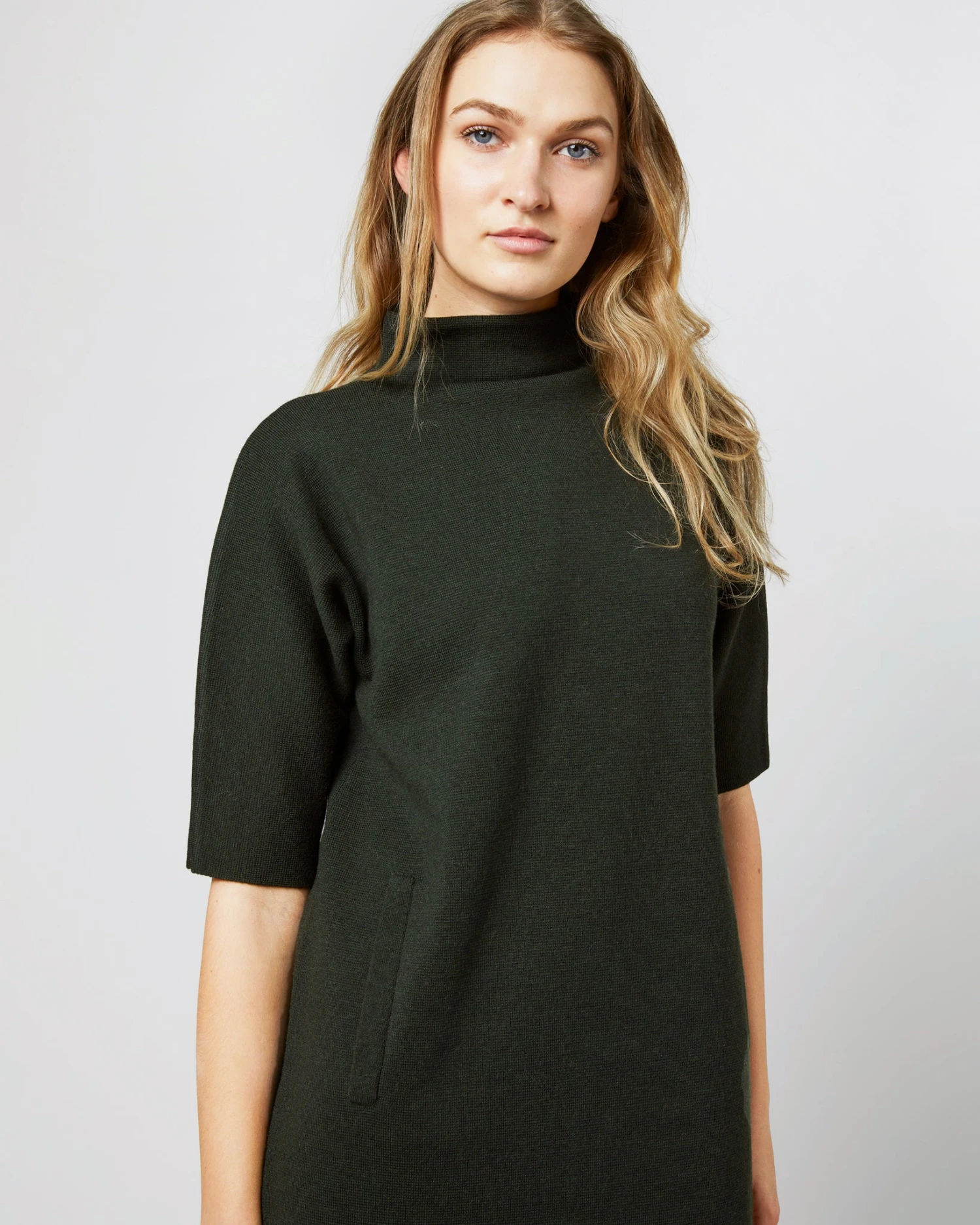 Rowan Short-Sleeved Funnel-Neck Dress In Bottle Green Merino Wool