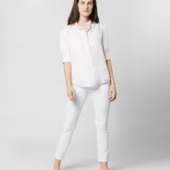 Between watermelon and two shades of blue, this Italian poplin tattersall shirt has an excellent color combination going on. It’s got a modified spread collar with lightweight, nonfused interlining for a soft, relaxed look. As always, the cut is slim but never skinny, with a high armhole for mobility and a long-enough-to-stay-tucked-in shirttail. (Sid likes it this way, but you can always get it shortened.) It’s made with single-needle stitching, 22 stitches/inch, flat-felled seams, and thick, 3.5mm Trocas shell buttons.