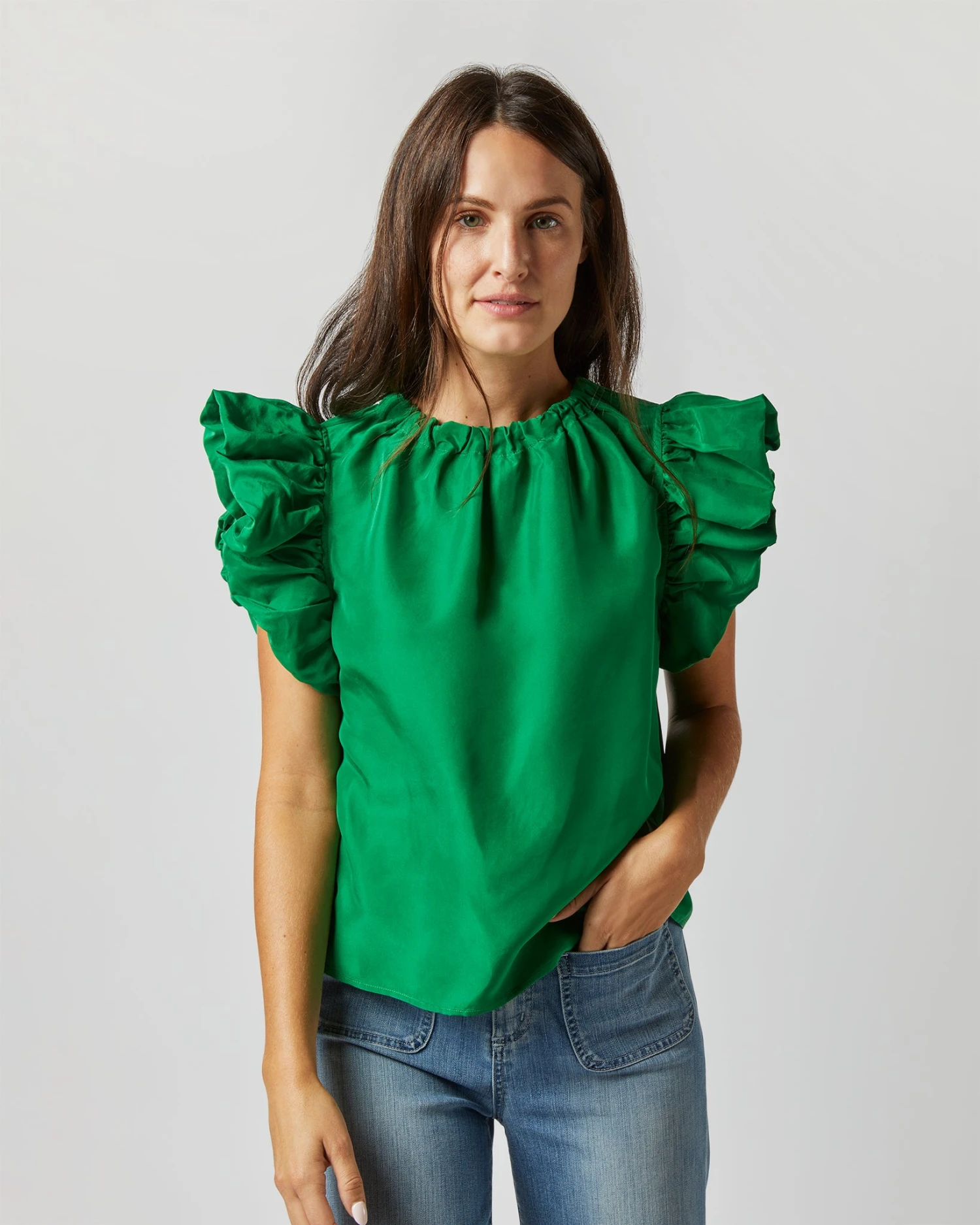 In-store favorite Ulla Johnson makes feminine, bohemian pieces that are heavy on handcraft and special details. The Iren silhouette feels quintessentially UJ with voluminous flutter sleeves and a romantic tie at the back of the neck. It’s made of silk taffeta in a beautifully saturated shade of emerald green. Wear it on its own or go for the full look with the matching skirt