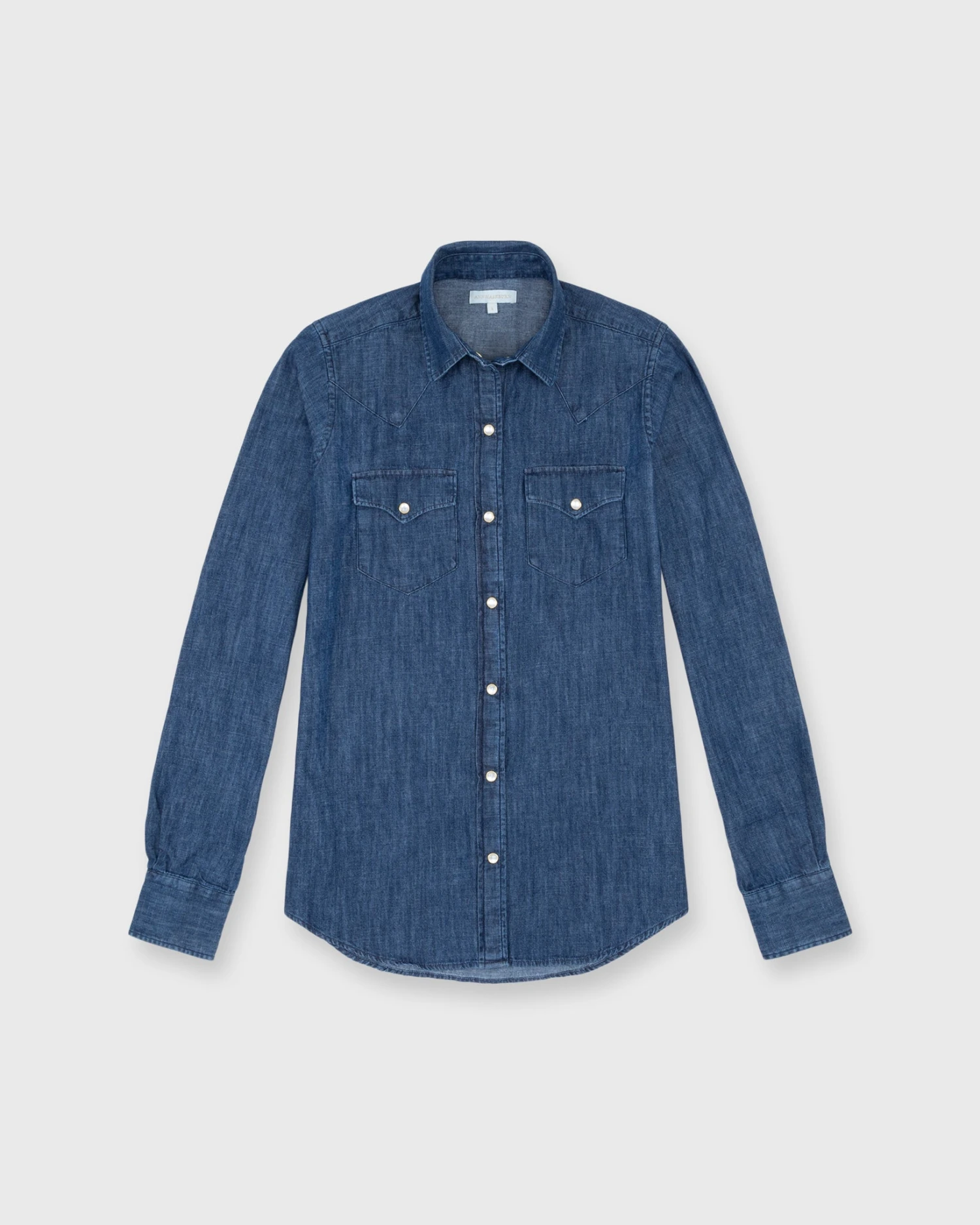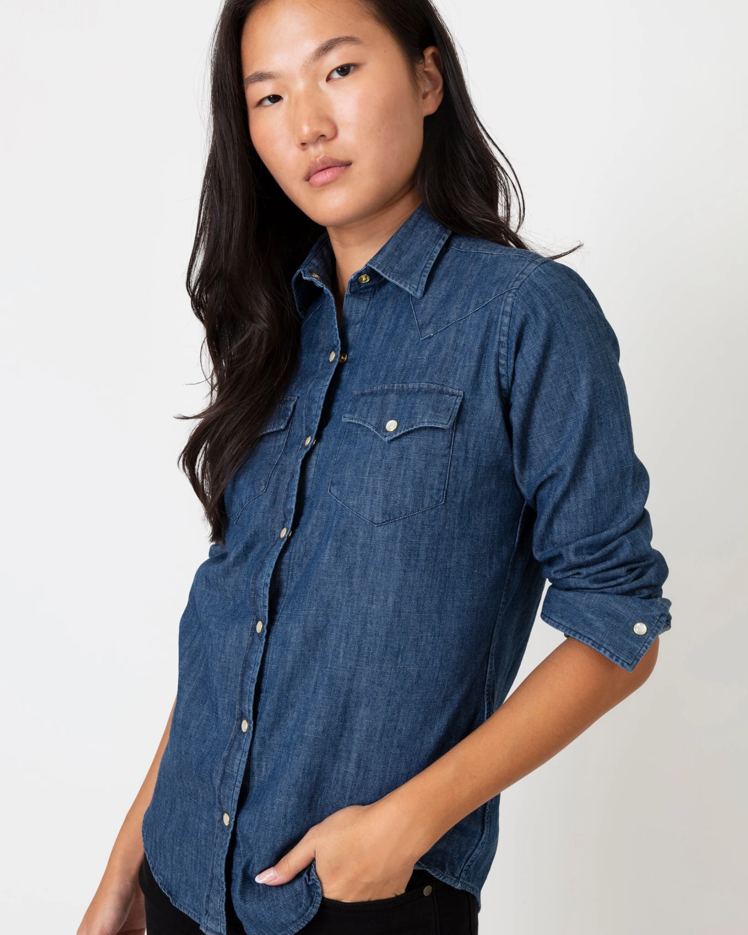 This is an easy-fitting Western-style shirt, down to the pointed yoke, the pearl snaps, and and the twin front pockets. The shape is a little oversized so you can wear it on its own or layer it over a tee or a dress like you would with a lightweight jacket. It’s made from a soft, washed-down indigo denim with a little fading.